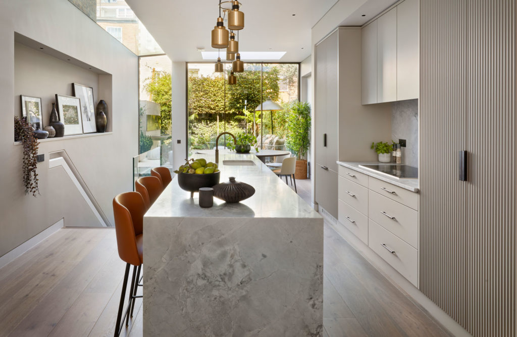This elegant property underwent a full external strip out to include all roof, internal structure and rear elevation facade. This allowed us to create a full basement along with frameless glass infill from basement to 1st floor along with internal refurbishment to include lighting, integrated audio visual. The use of solid timbers, marble and polish plaster allowed us to create an incredible property.
